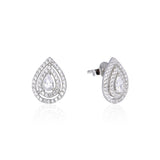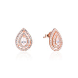 Boucles d'oreilles en Argent 925 ou plaqué Or rose. Ornée d'une pierre centrale en zirconium sous forme de poire. Habillée par deux rangs de pierres. Des boucles d'oreilles indémodables et raffinées.