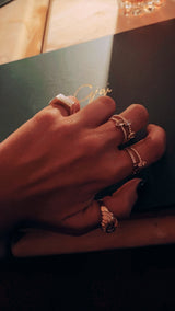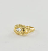 Bague en plaqué Or 3 microns, entourée par des détails pliée donnant l'effet d'entourée la pierre centrale en zirconium.