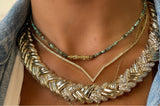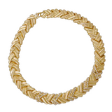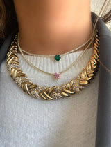 Collier en plaqué Or créé par de grosses mailles tressées, alternant parfaitement entre un effet lisse et d'autres ornés de zirconiums scintillants. Un design minimaliste pour une élégance quotidienne.