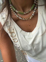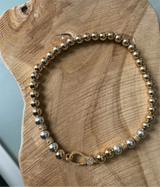 Collier Julie mélangé en or blanc et or en acier. Des boulez reliées viennent élégamment crée le collier des zones en zirconium viennent l'habiller, ainsi qu'un fermoir centrale ornées de zirconium. Une pièce d'élégance intemporelle.