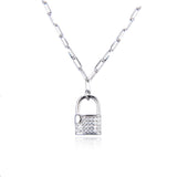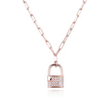 Collier Cadenas en Argent 925, plaqué Or jaune ou rose. Chaine avec un effet maille qui suspend élégamment un cadenas serti de zirconiums. Une pièce originale et élégante pour toute occasion.
