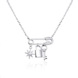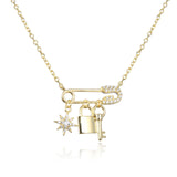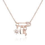 Collier Kara Argent 925, plaqué oOr jaune ou rose. Une chaine fine soutient élégamment un fermoir en forme d'épingle accompagné de breloques symboliques, le tout orné de zirconiums. Un bijou unique pour exprimer votre personnalité.