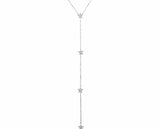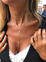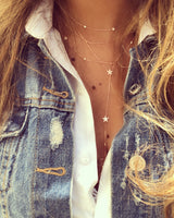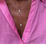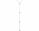 Collier pendant Étoile en Argent 925, plaqué Or jaune ou rose. Une base de chaine élégante soutient une longue chaine avec des étoiles serties de zirconiums alignées. Intemporel et élégant il vous accompagnera au quotidien.